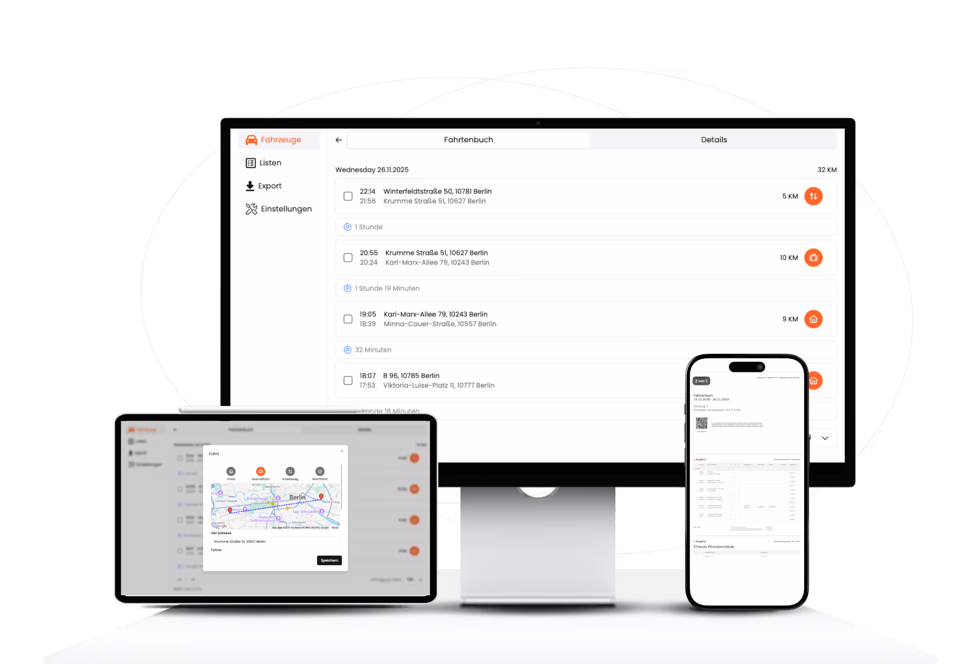 TrackPro ist vollständig geräteunabhängig nutzbar und passt sich automatisch an unterschiedliche Endgeräte an. Ob im Büro am Desktop, unterwegs auf dem Tablet oder direkt auf dem Smartphone – alle Funktionen stehen jederzeit in gleicher Qualität zur Verfügung.
