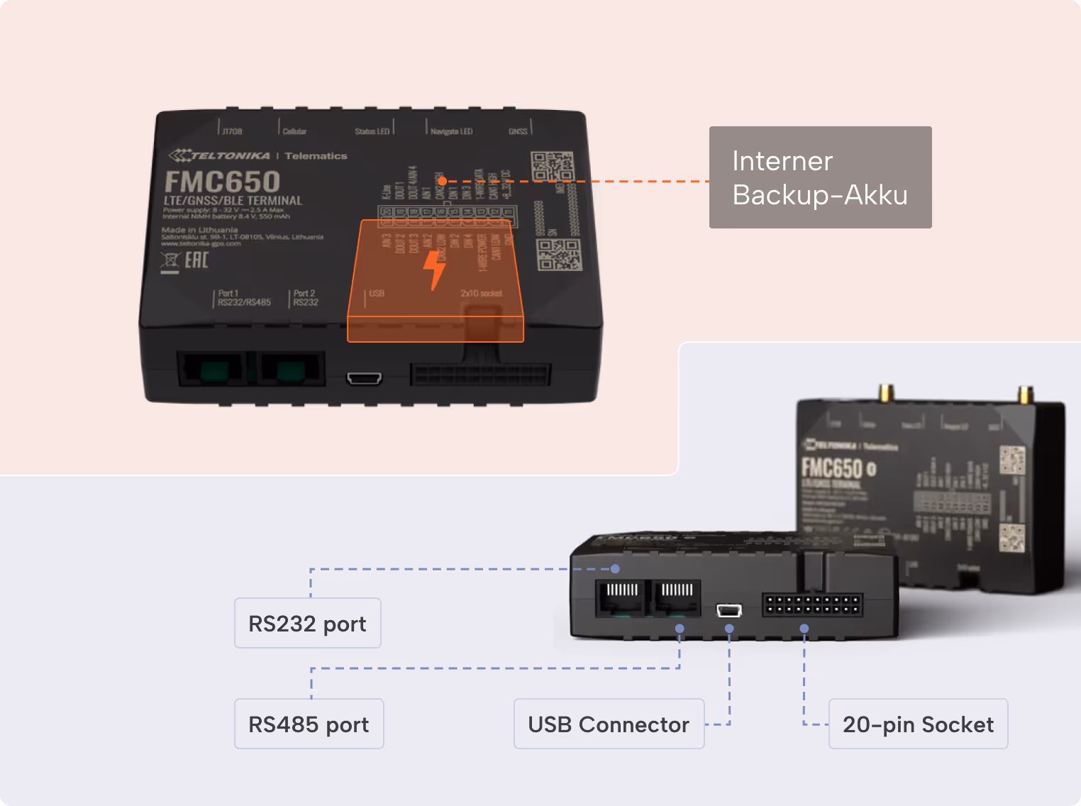 Der FMC650 verfügt über eine integrierte 550 mAh Ni-Mh Backup-Batterie. Diese dient zur Sicherung der Datenübertragung, falls die externe Stromversorgung unterbrochen wird